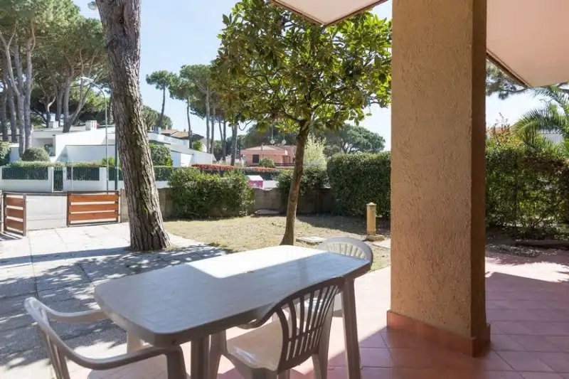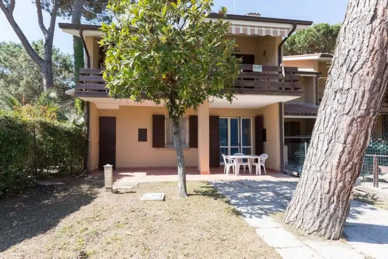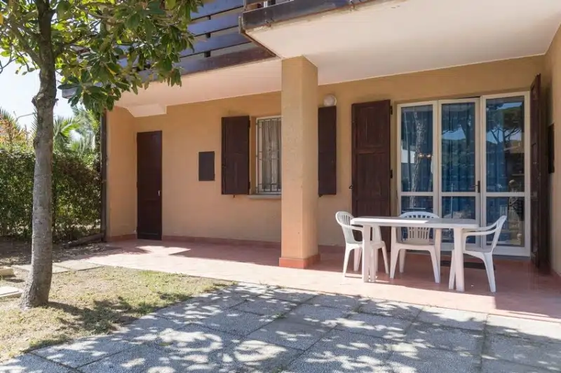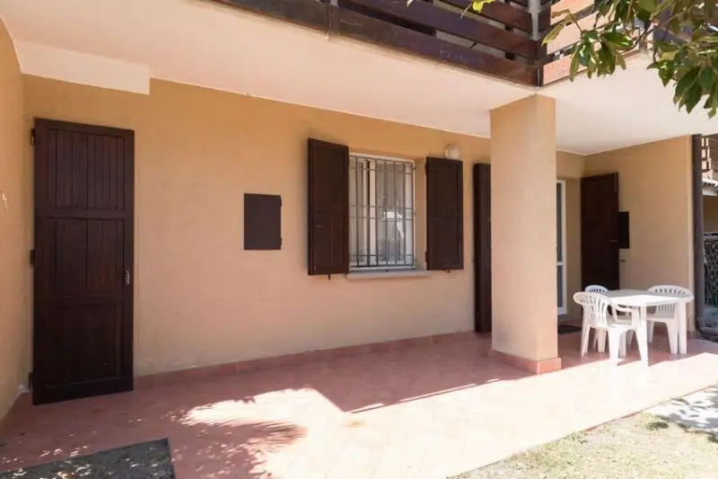 Villetta al piano terra così composta Giardino con patio, ripostiglio Soggiorno con angolo cottura camera matrimoniale camera con due letti a terra/matrimoniale bagno Portico comunicante con la zona giorno con caminetto